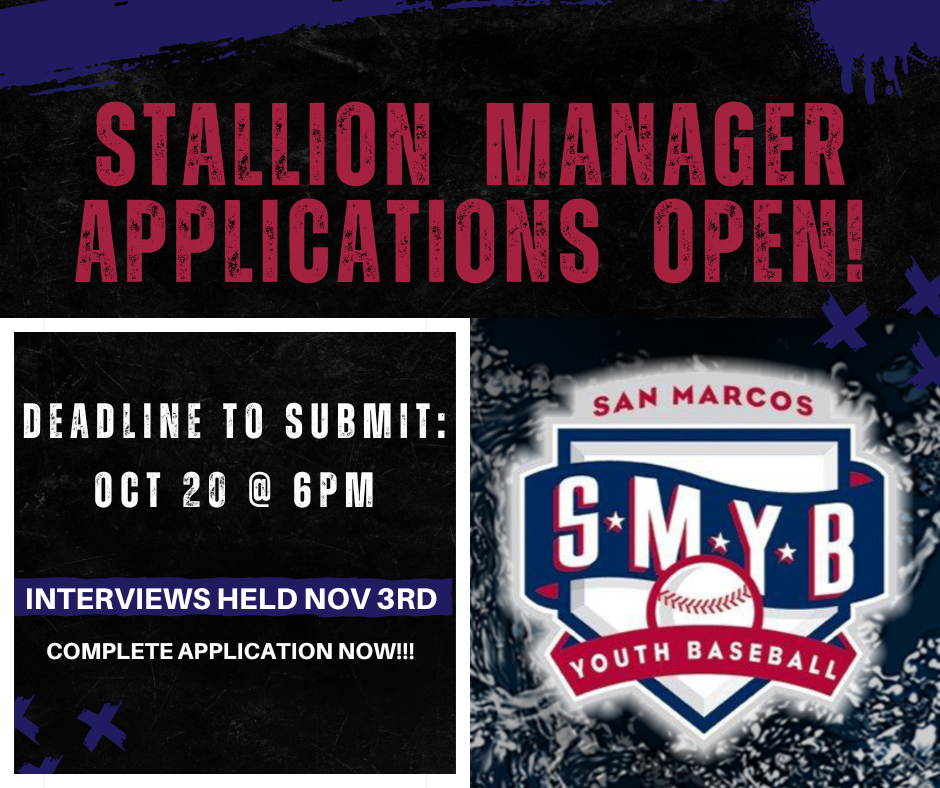 Stallion teams: 7U, 8U, 9U, 10U, 11U, and 12UDeadline to submit is October 20 at 6pm. Interviews will be November 3. Apply here: https://forms.gle/r5uJ4hdV1uo3HK5CA